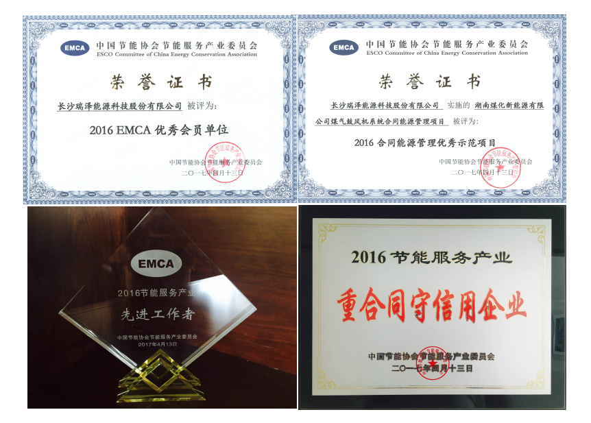 會上,瑞澤能源榮獲“2016年節能服務產業重合同守信用企業”“EMCA優秀會員單位”和“2016合同能源管理優秀示范項目”獎項,公司總經理榮獲“2016年節能服務產業先進工作者稱號”。